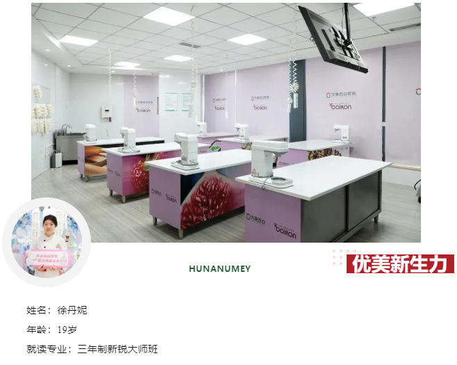 徐丹妮,今年19岁。一年前,刚高中毕业的丹妮站在人生的分岔路口。从小热爱甜品的她,渴望将爱好变成职业。“直到刷到长沙优美西点学员作品展示—那栩栩如生的蛋糕人偶、层次分明的欧包切面,还有老师手把手教学的场景,就决定来学校看看。通过实地考察,她看到国际赛事标准设计的教室,以及贴在走廊里的学员就业喜报,她知道这里能教会她真本事!