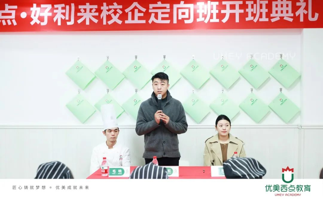 10月22日,湖南优美西点为“好利来校企定向班”举行了开班典礼,新学员们精神饱满,热情洋溢地迎接即将到来的技术学习之旅。 随着教务冯老师的开幕欢迎词,好利来校企定向班的开班典礼拉开了帷幕。湖南优美西点的校长徐义松先生、好利来的人事经理王经理及优美西点的相关教务负责人和教师代表均出席了此次活动,共同见证这一重要时刻。